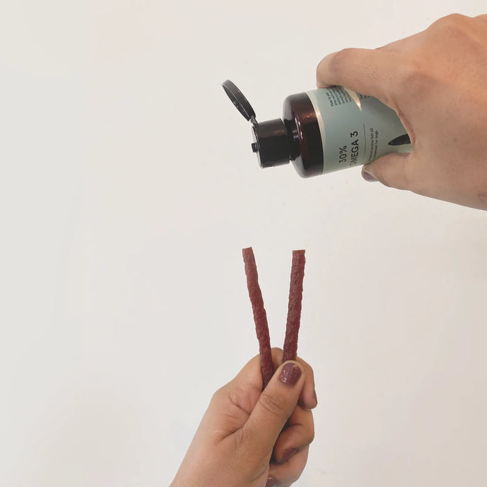 You can also drizzle fish oil over treats/snacks or add it to your dog’s licki mat & serve.